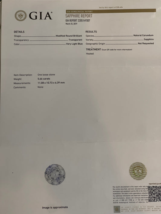 5.66 Natural GIA Certified Round Brilliant White (Very Light Blue) Sapphire