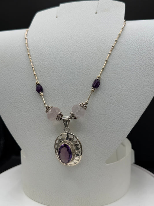 Handmade Natural Amethyst & Rose Quartz Sterling Silver Adjustable Necklace