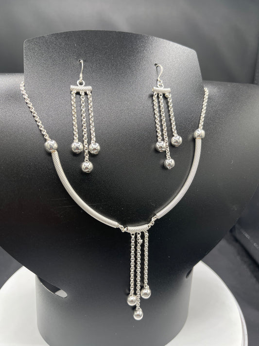 Handmade Indian 925 Sterling Silver Bead Necklace & Dangle Earring Set - Bib Style