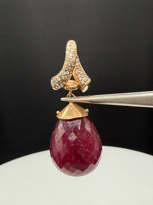 Natural 82 Carat Ruby Briolette & Diamond 14k Gold Pendant