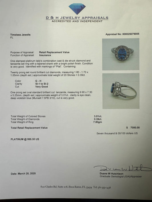 Natural 3.48 Carat Tanzanite & Diamond Platinum Ring – Size 7.5