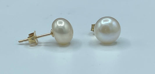 Natural Freshwater Pearl 14k Yellow Gold Stud Earrings | 7 MM Cultured Pearls | Handmade Quality | Solid 14k Gold Posts & Backings