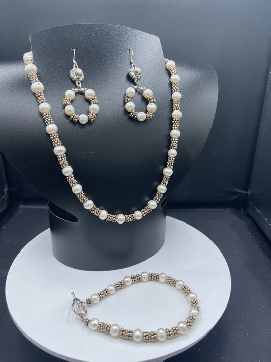 Natural Freshwater Pearl Bali Sterling Silver Bead Handmade Necklace Bracelet & Earring Set