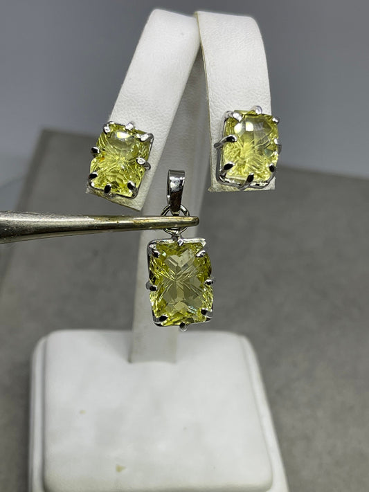 Natural Green Amethyst Sterling Silver Earrings & Pendant Set