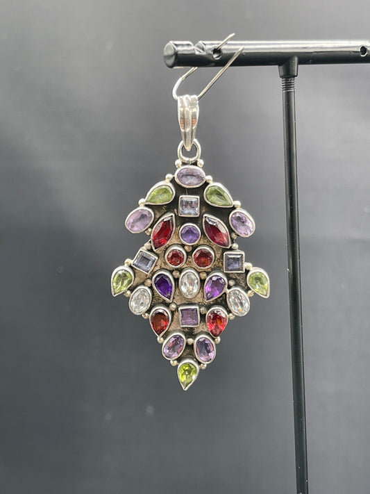 Natural Garnet Amethyst Peridot Iolite & White Topaz Sterling Silver Pendant