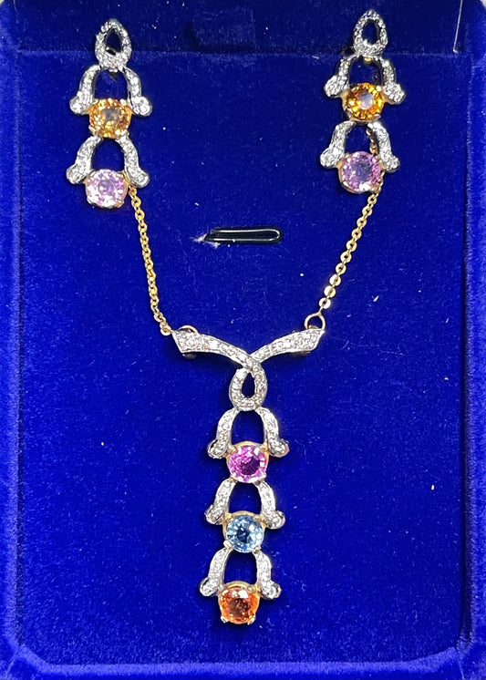 Natural Multi Color Sapphire & Diamond 18k Yellow + White Gold Necklace + Earring Set