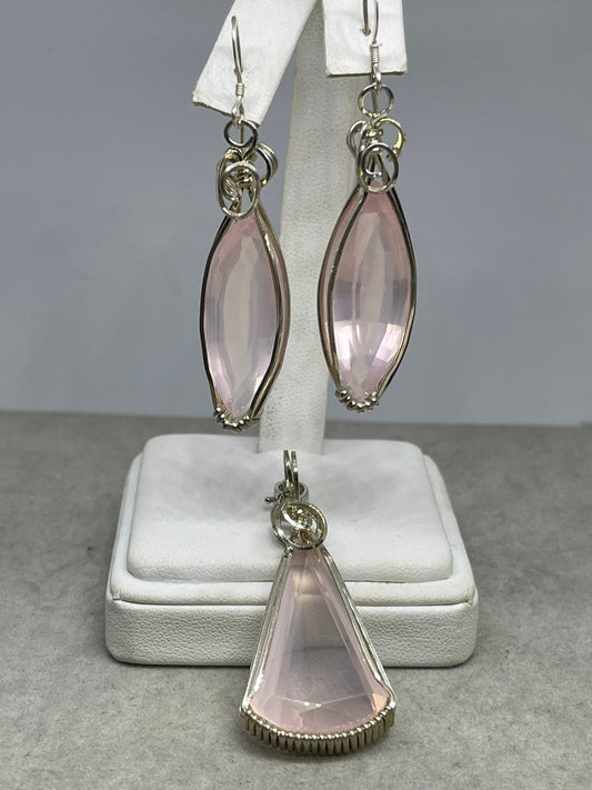 Rose Quartz Wire Wrapped Sterling Silver Earrings & Pendant Set