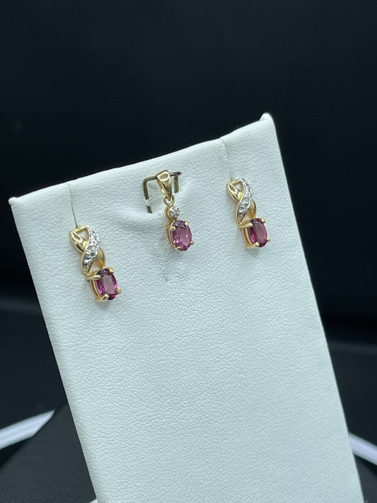 Rhodolite Grape Garnet Diamond 14K Gold Earring and Pendant Set