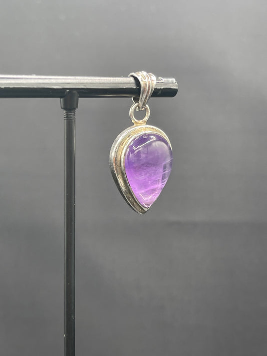 Vintage Natural Amethyst Pear Cut Cabochon Sterling Silver Pendant