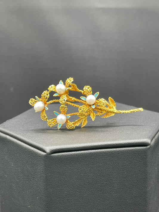Vintage Freshwater Pearl & Turquoise 18k Yellow Gold Brooch Pin