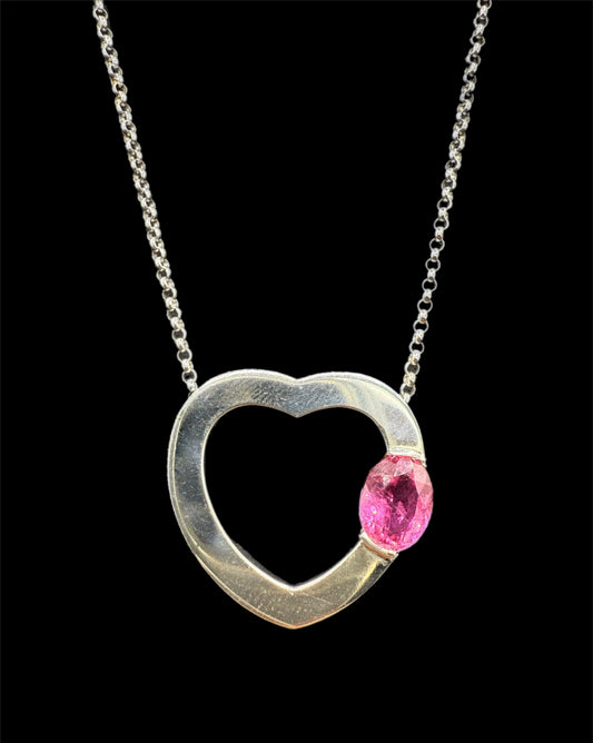 Vintage Rubellite Tourmaline Heart Necklace – 14k White Gold Pendant & 18” Chain – 2 Carats – Italian Made