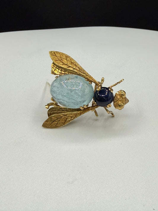 Vintage Natural Aquamarine & Sapphire 18k Yellow Gold Bumble Bee Brooch