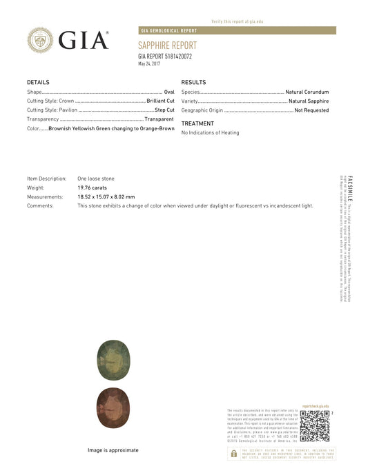 GIA Certified 19.76 Carat Natural Color Change Sapphire | No Heat | Oval Brilliant Step Cut