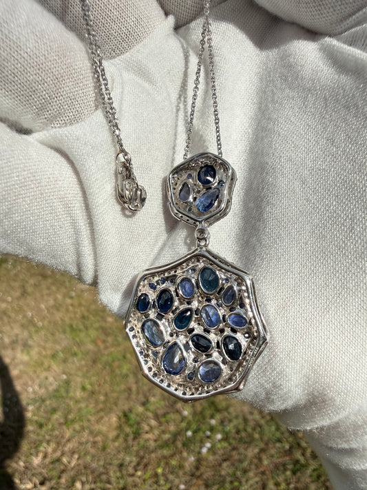 Natural Blue Sapphire & Diamond Pendant 14k White Gold Necklace | 9.40ct Sapphire + 0.36ct Diamonds