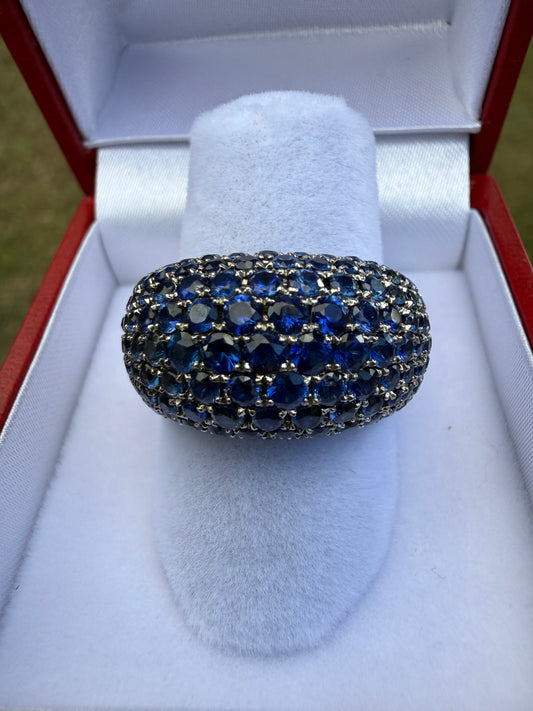 11.55 Carat Natural Blue Sapphire Cluster 18k White Gold Ring | Pavé Dome | Vintage Style Cocktail Ring | Size 7