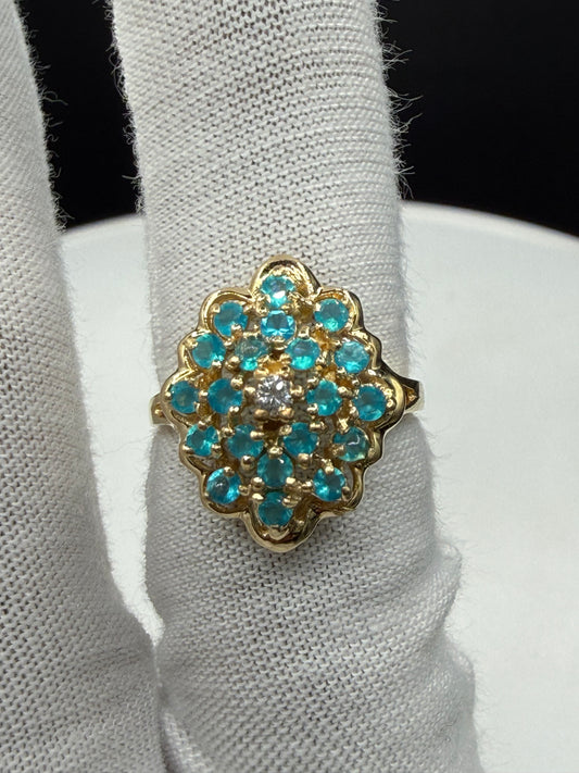 Luxury Paraiba Chalcedony & Diamond Cluster 14k Yellow Gold Statement Ring | Size 6.25