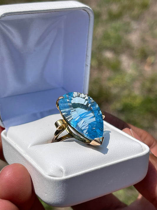30.03 Carat Blue Topaz Custom Pear Cut 14k Yellow Gold Ring (Size 10)