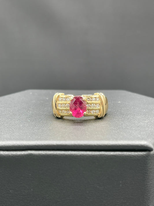 Natural Rubellite Tourmaline & Diamond 14k Yellow Gold Ring (Size 8.5)