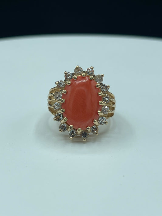 6.68 Carat Natural Italian Coral & White Topaz 14k Yellow Gold Ring (Size 7.25)