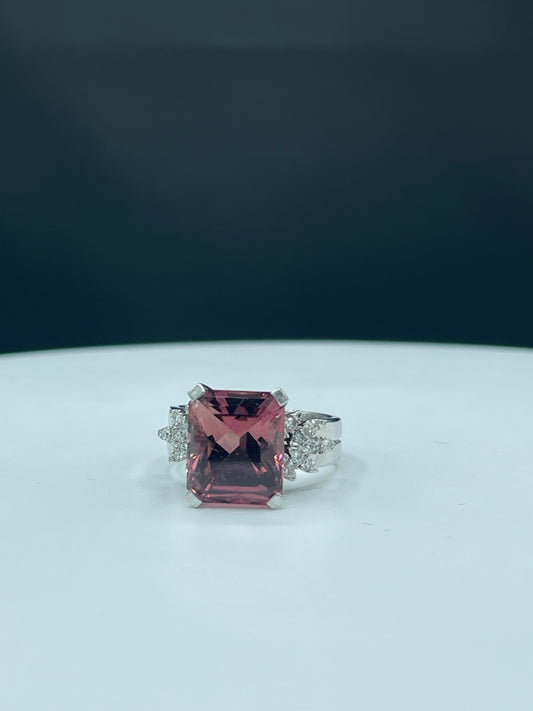 Natural Pink Rubellite Tourmaline Custom Precision Cut & Diamond 18k White Gold Cocktail Ring (Size 10)