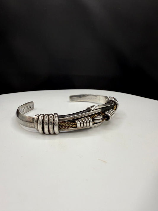 Handmade Sterling Silver & Leather Men’s Cuff Bracelet | Solid 925 Mexico | 34.3g Heavyweight Vintage Biker Jewelry