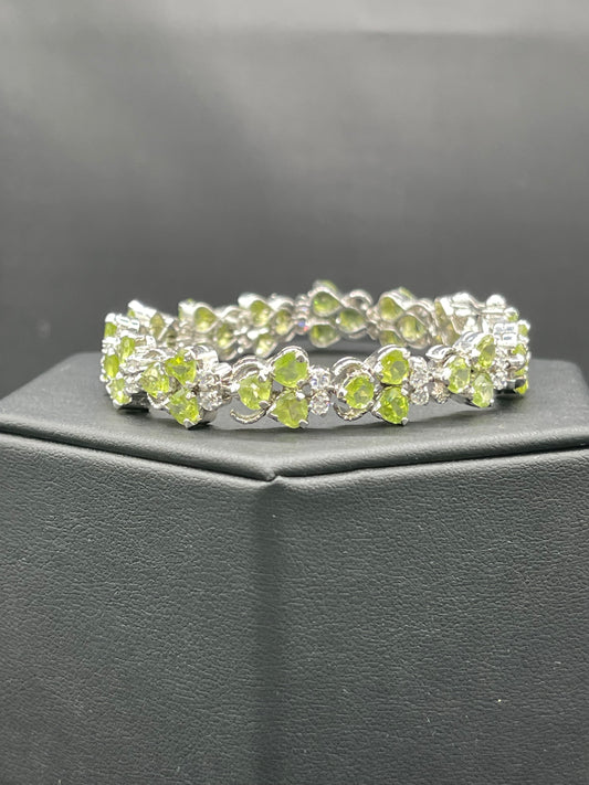 Natural Perdiot & Cubic Zirconia Heavy Sterling Silver Bracelet