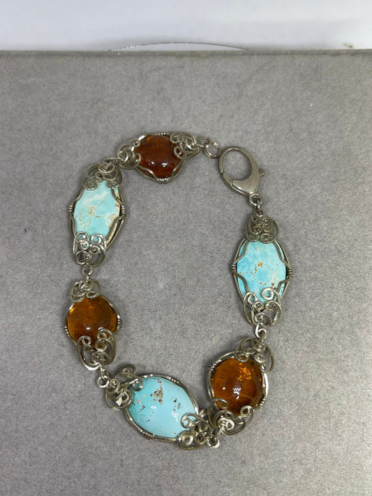 Natural Turquoise & Amber Sterling Silver Wire Wrapped Handmade Bracelet