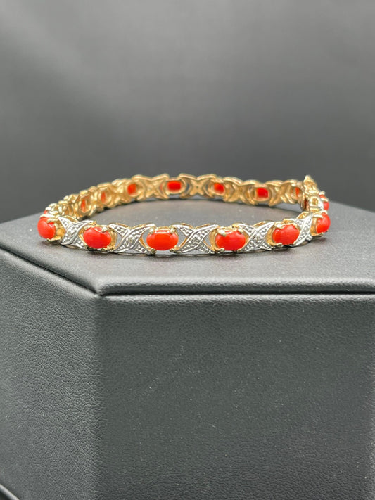 Natural Italian Red Coral & Diamond Sterling Silver 18K Vermeil Bracelet