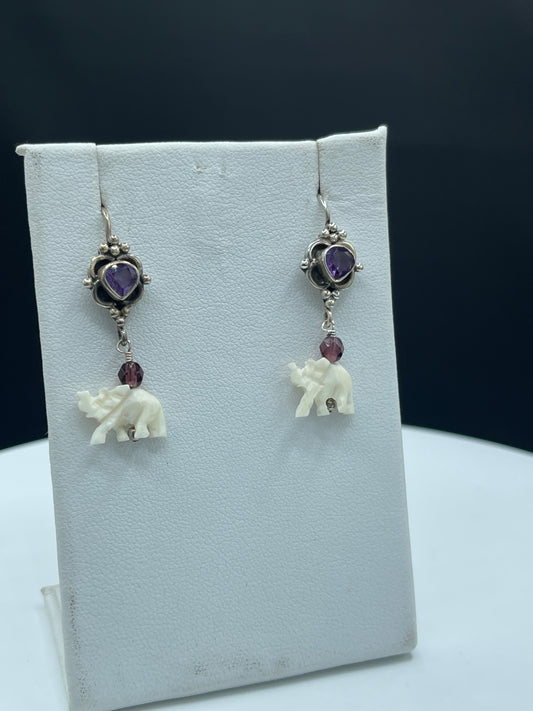 Natural Amethyst & Garnet Ivory Elephant Sterling Silver Dangle Earrings - Handmade, 1.48 Inches