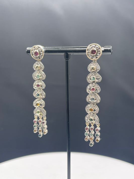 Antique Victorian Multi-Color Sapphire & Diamond Dangle Earrings 18k Yellow Gold + Sterling Silver