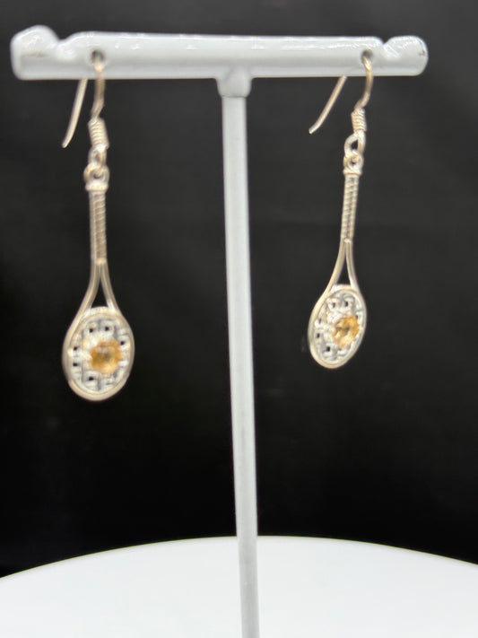 Handmade Sterling Silver Tennis Racket Earrings with Natural Citrine | 925 Stamped | 1.88 Inches