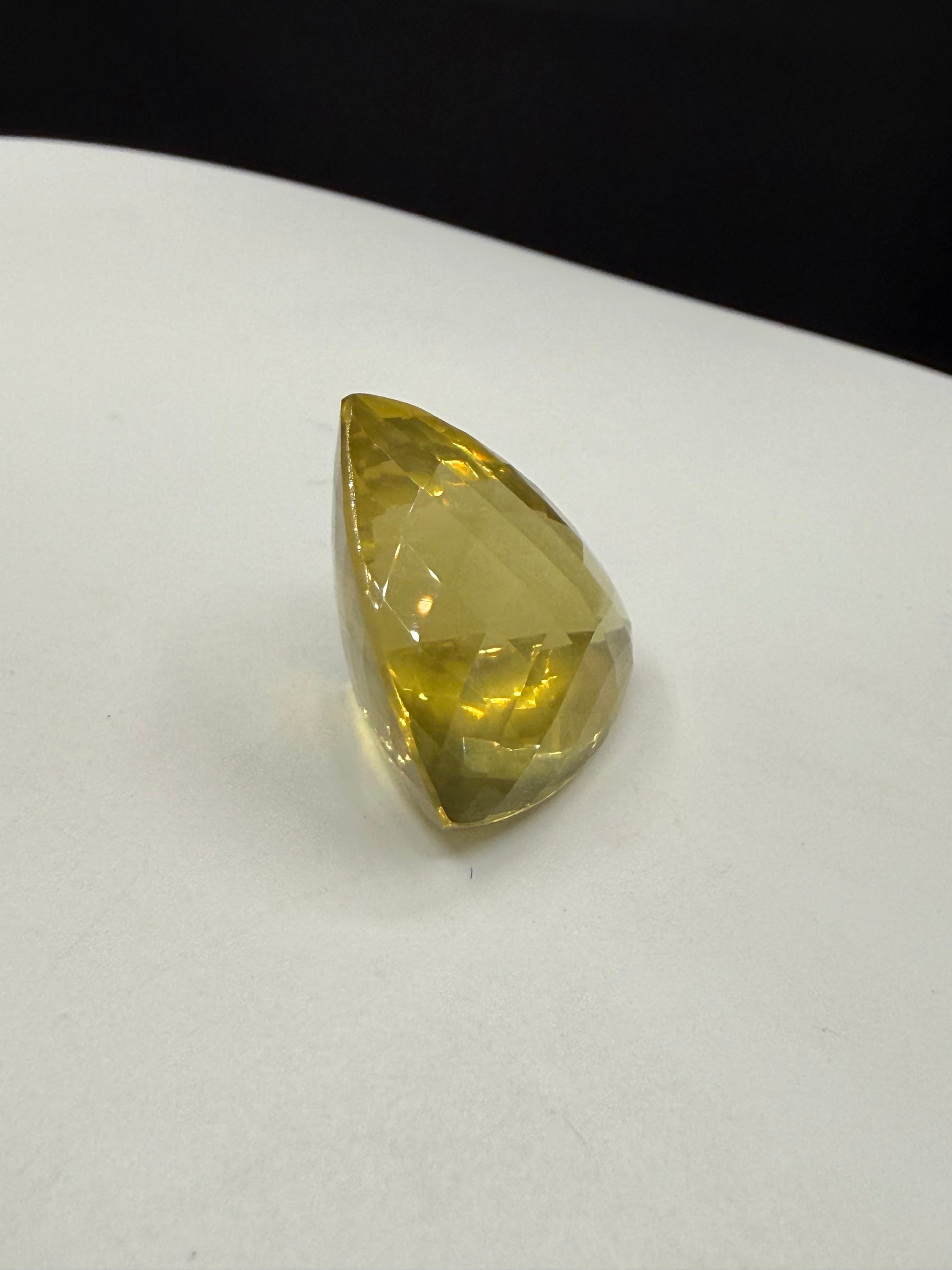 This exceptional 37.91 carat Natural Ouro Verde Quartz is a true showpiece — expertly cut into a striking trillion checkerboard design that radiates brilliance from every angle. Measuring 24.35 x 23.92 mm, this gem displays a vivid golden-green hue unique to Ouro Verde quartz and boasts internally flawless clarity.