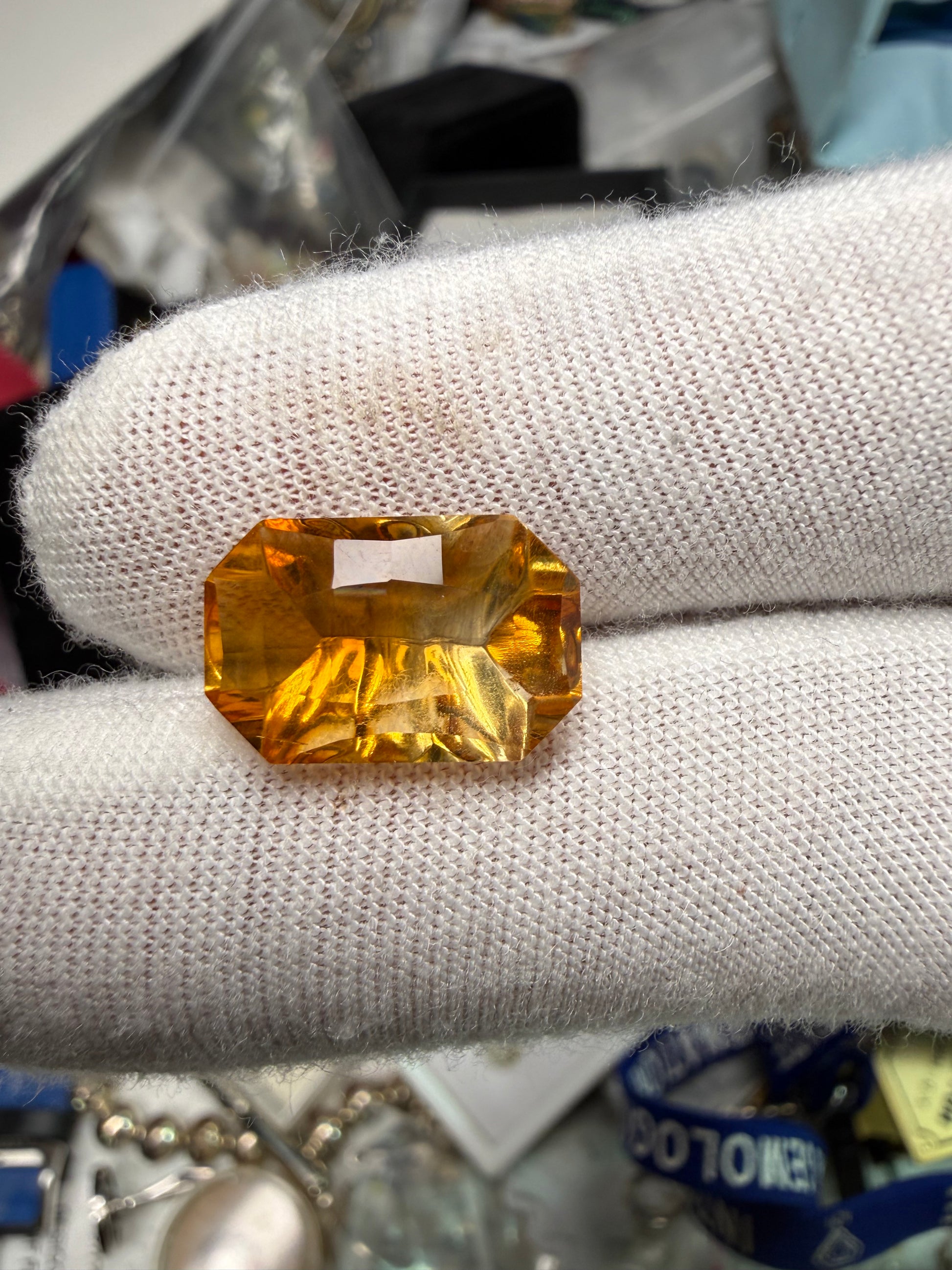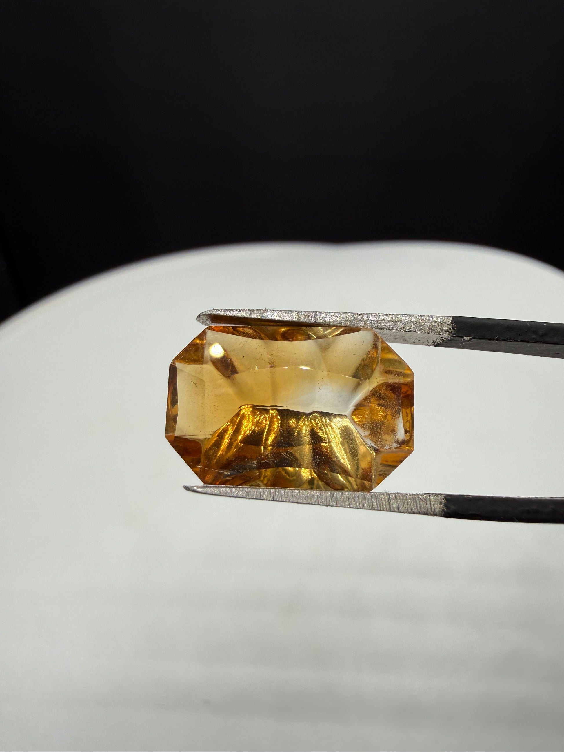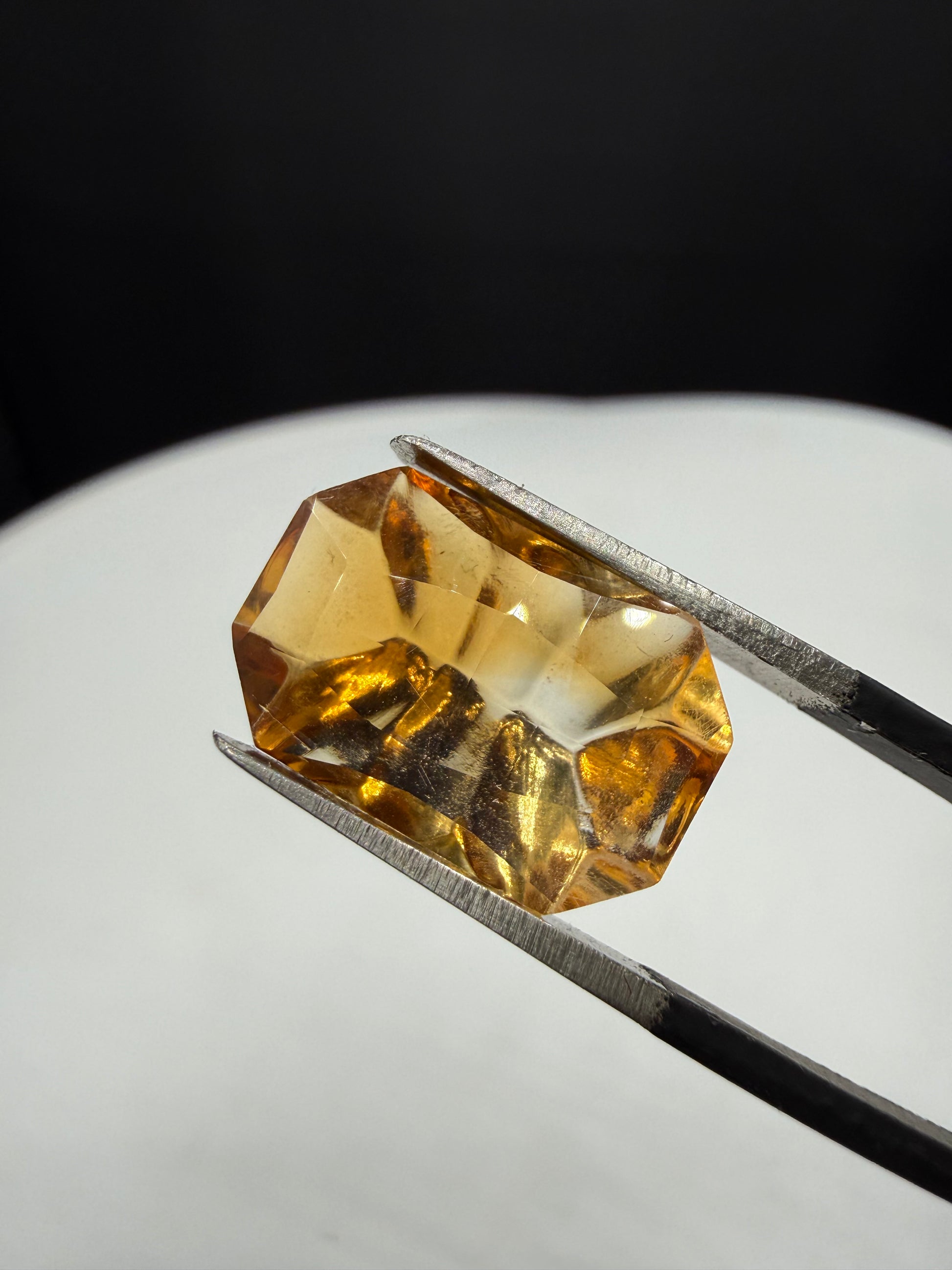 A breathtaking untreated natural citrine, masterfully crafted in a fantasy concave emerald cut with a checkerboard-cut face that catches light from every angle. This gem’s golden brilliance and sculptural faceting make it truly one-of-a-kind — ideal for a custom jewelry design or fine gemstone collection.