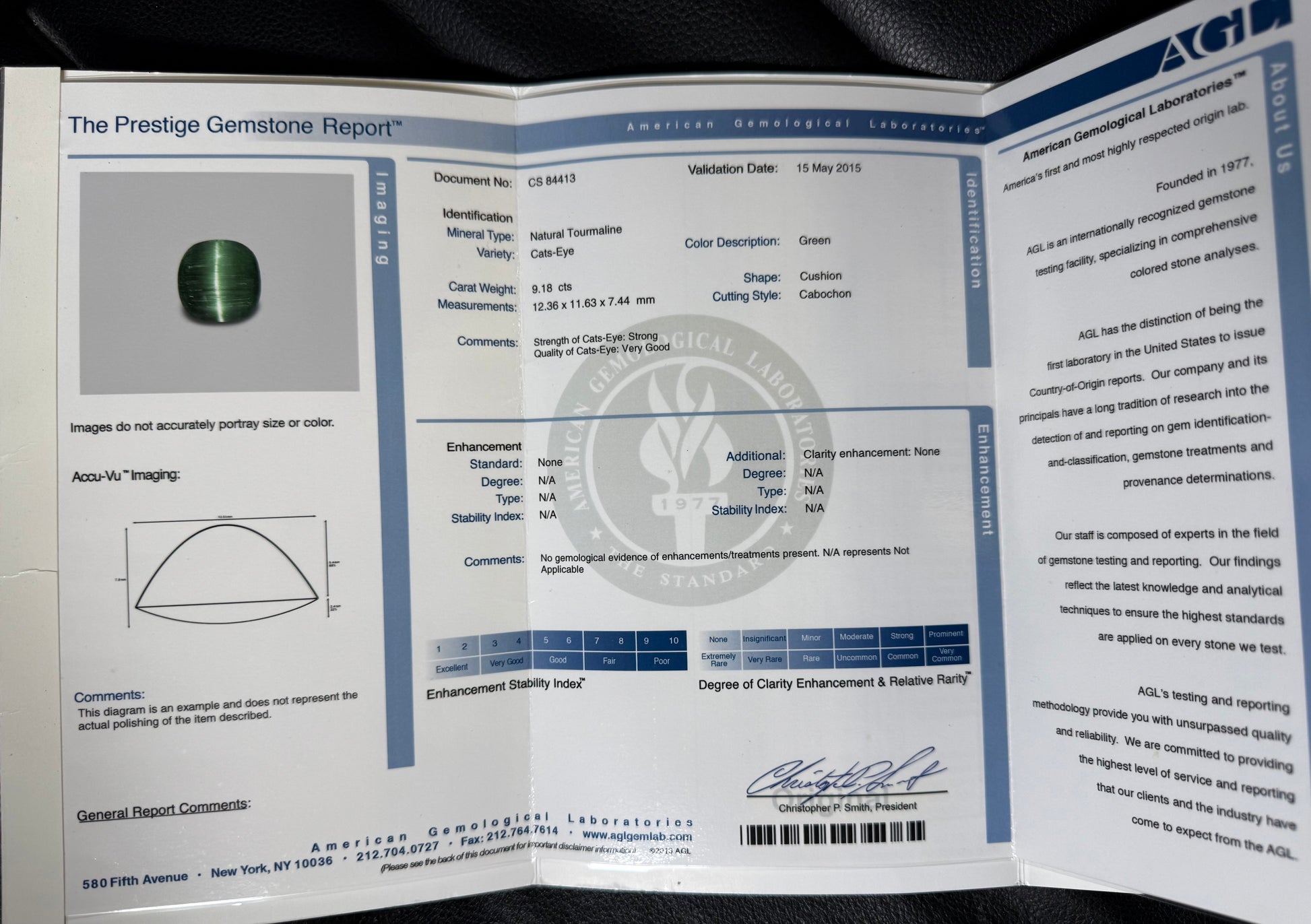 • Center Stone: 9.18 ct Natural Cat’s-Eye Green Tourmaline (AGL Certified)