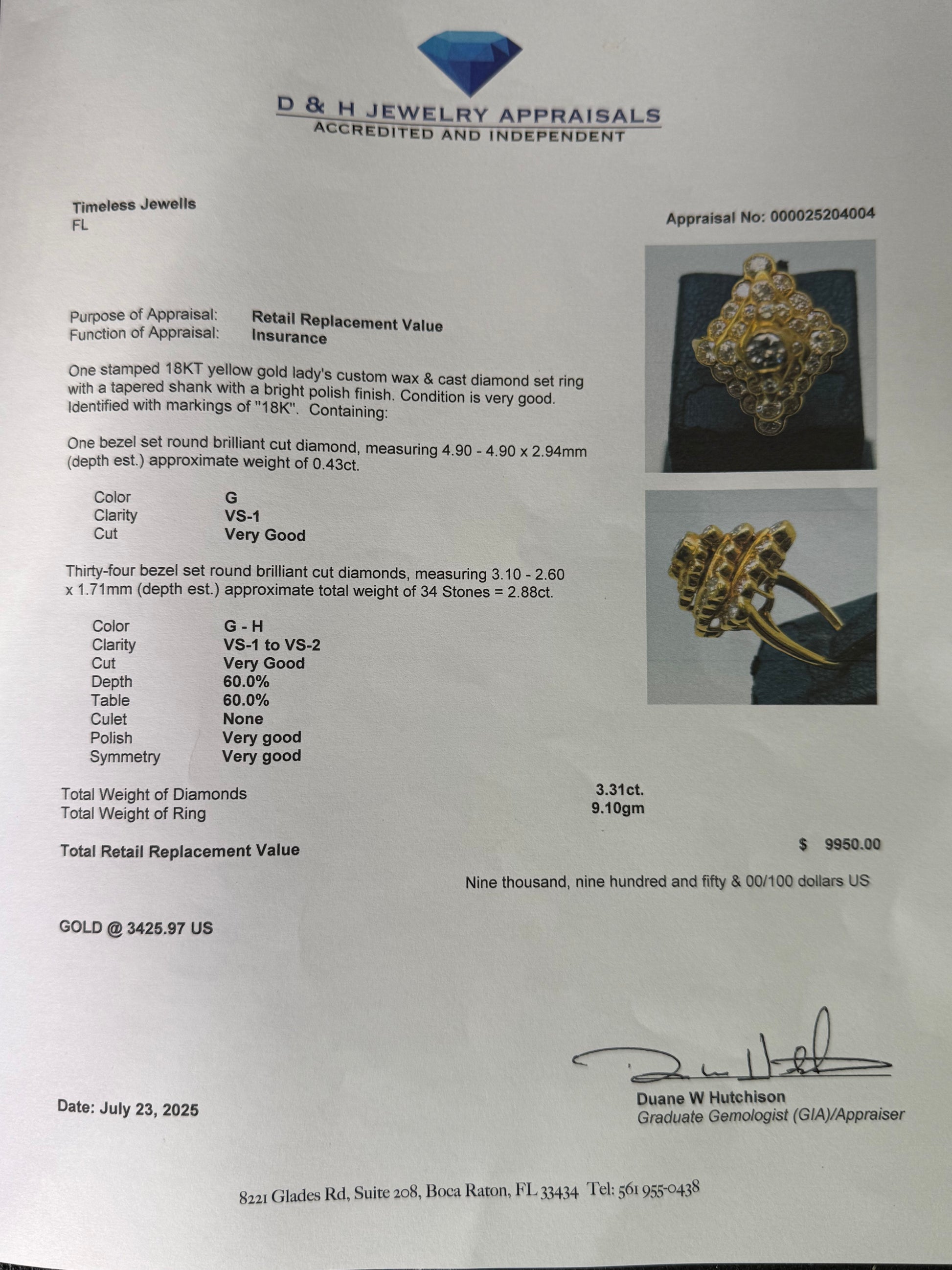 With a combined diamond weight of 3.31 carats and a substantial 9.10 gram gold setting, this ring embodies prestige and sophistication. The diamonds, graded G–H color and VS1–VS2 clarity, deliver remarkable brilliance and fire that light up the room.