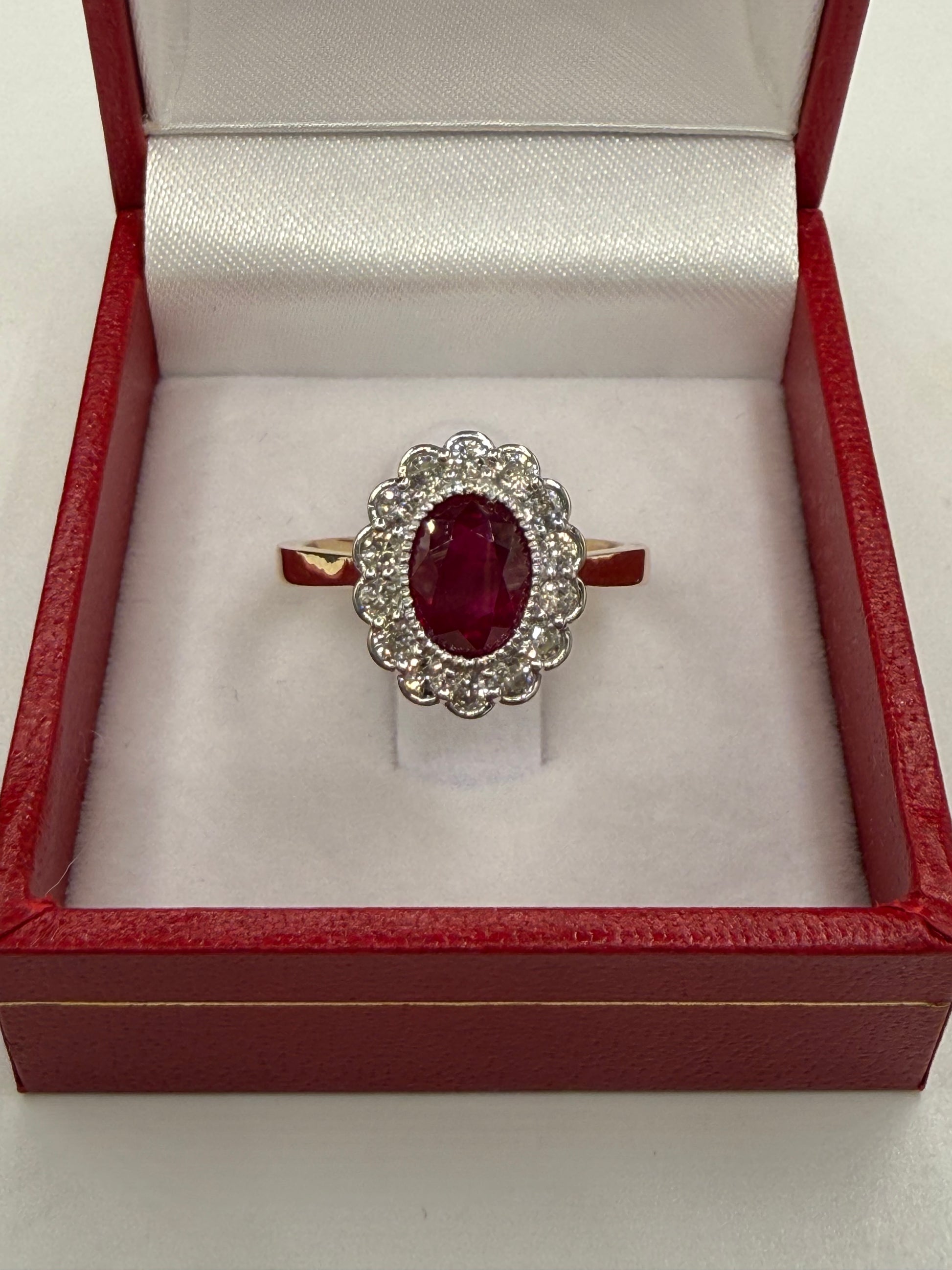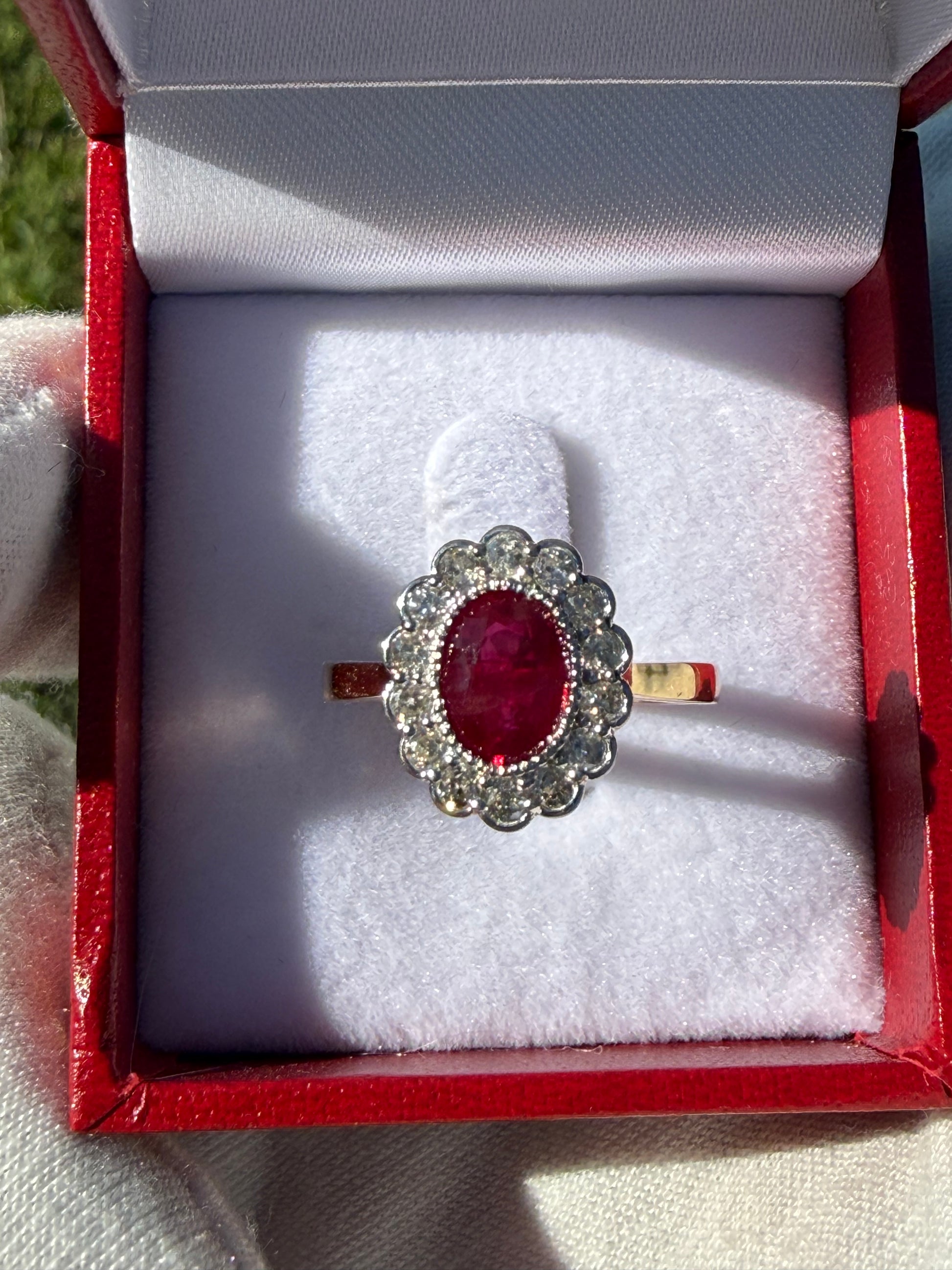 A timeless symbol of love and luxury — this GIA Certified Natural Ruby & Diamond Ring features an exquisite 1.58 carat natural ruby, elegantly framed by 0.42 carats of sparkling round brilliant diamonds in a classic halo design.