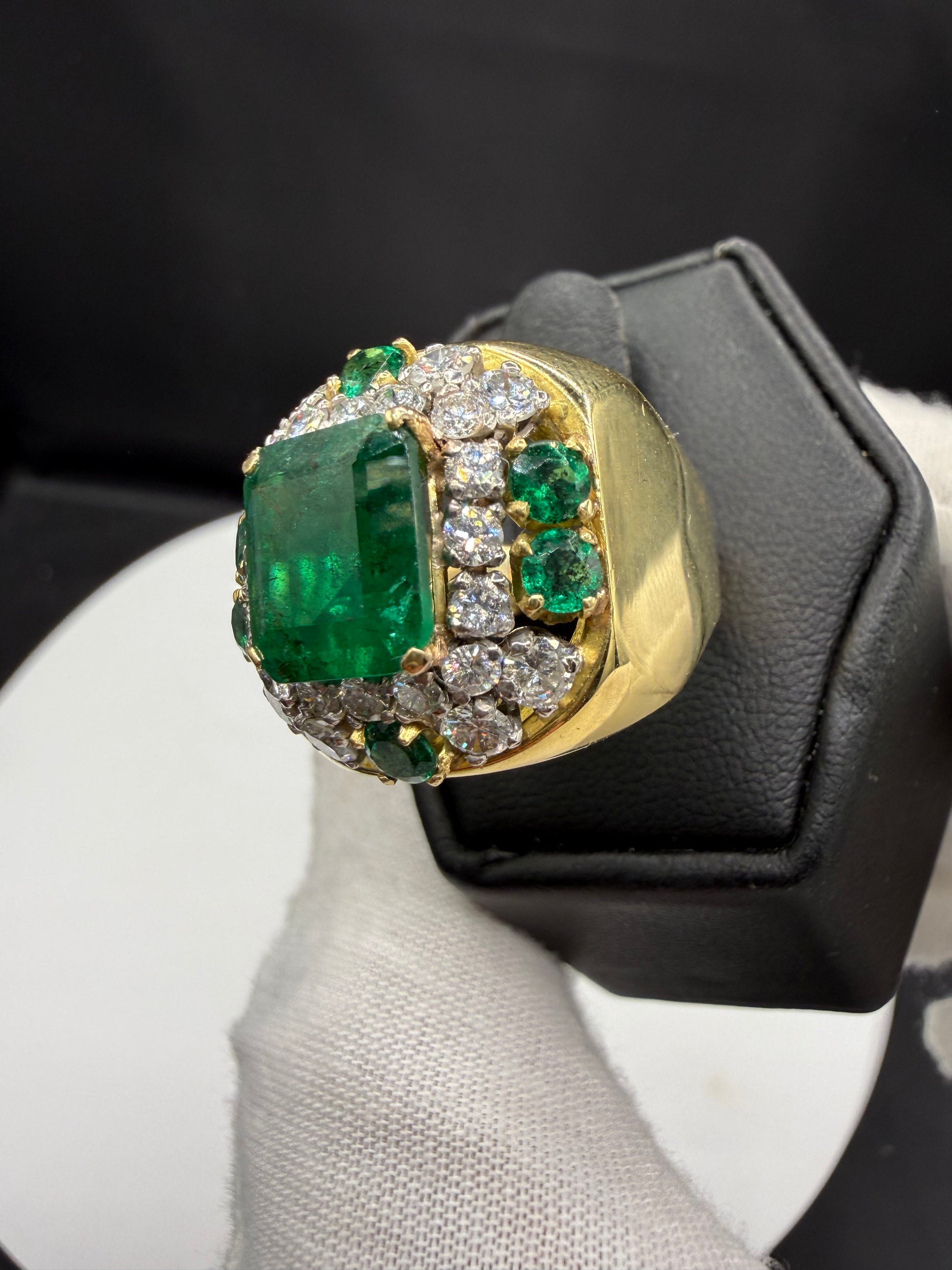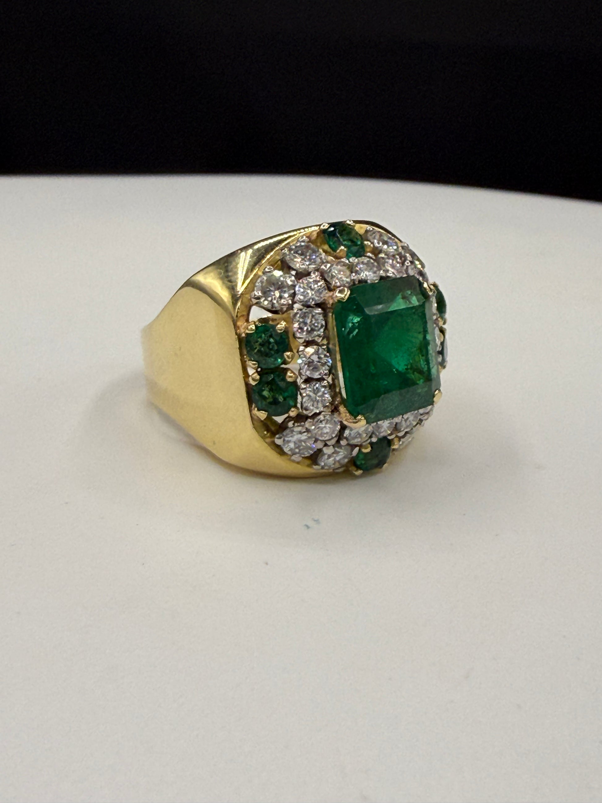 Adding to its grandeur, six round-cut emeralds (1.38 carats total) accent the design with harmonious green tones, balancing the richness of the centerpiece stone. Together, the emeralds and diamonds create an extraordinary total gem weight of 5.60 carats, set in a substantial 21.50 gram solid 18K yellow gold ring.