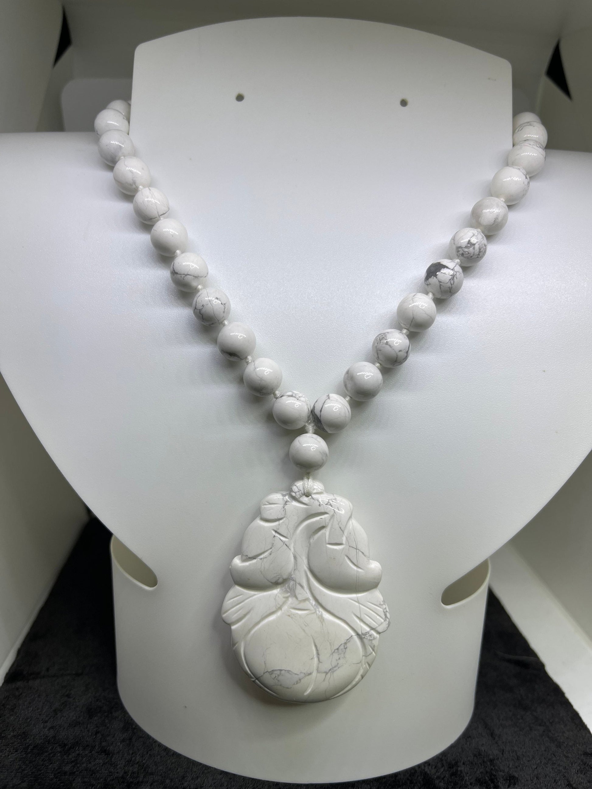 This is a gorgeous natural carved howlite beaded hand strung necklace. This necklace features a large carved howlite pendant that measures approximately 56x42 MM (25 MM = 1 inch). Each bead in this necklace measures approximately 10 MM each. This necklace is approximately 30 inches in length. Howlite strengthens memory and stimulates desire for knowledge. It teaches patience and helps to eliminate rage, pain and stress. A calming stone, Howlite calms communication, facilitates awareness and encourages emotional expression. Howlite balances calcium levels in the body. This necklace is handmade and one of a kind.