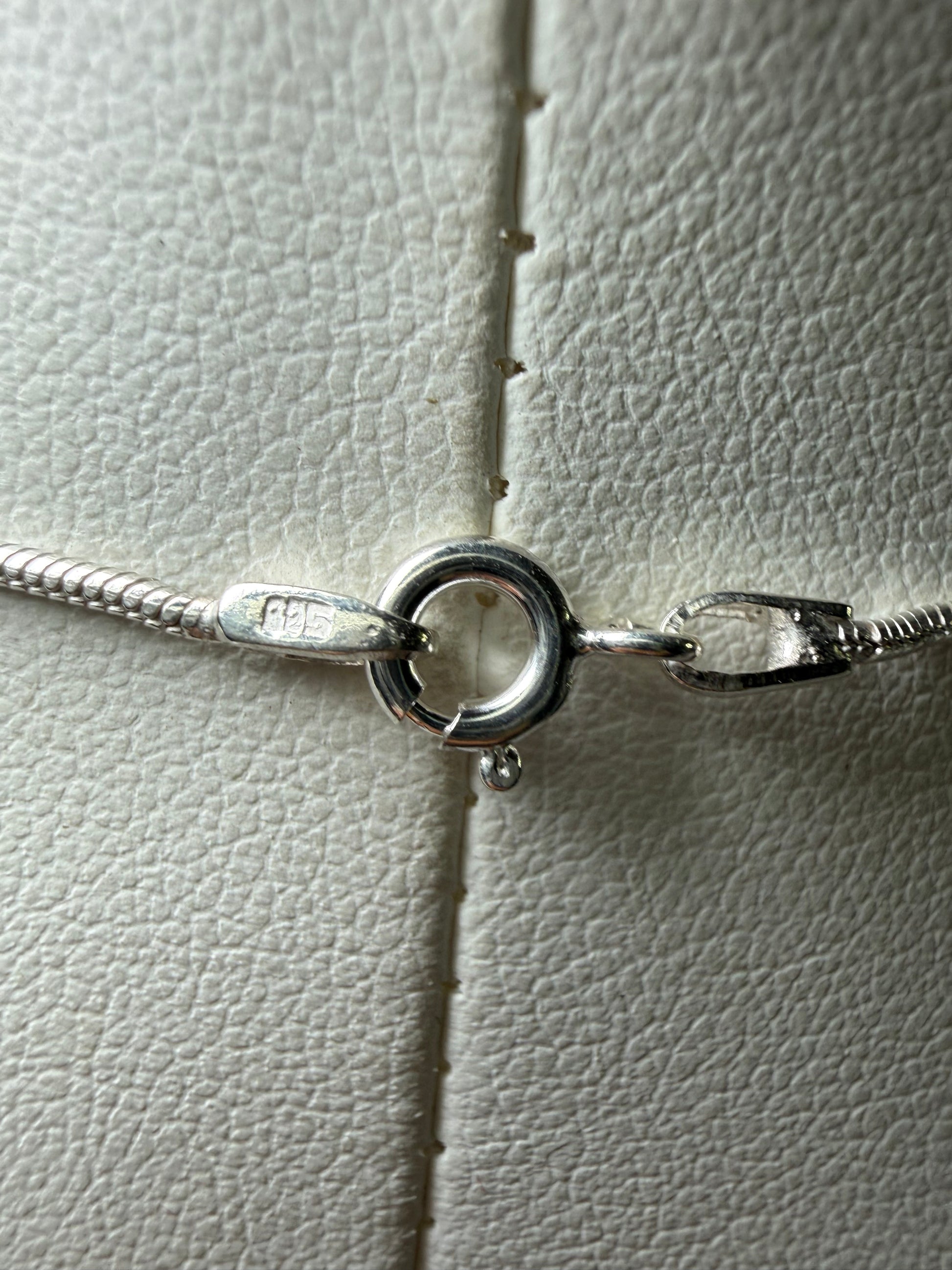 The pendant is set in solid 925 sterling silver and hangs from an 18-inch sterling silver chain, both stamped 925 for authenticity. The full drop length of the pendant is approximately 2 inches, and the entire piece weighs a substantial 29.92 grams, giving it a luxurious, well-made feel.