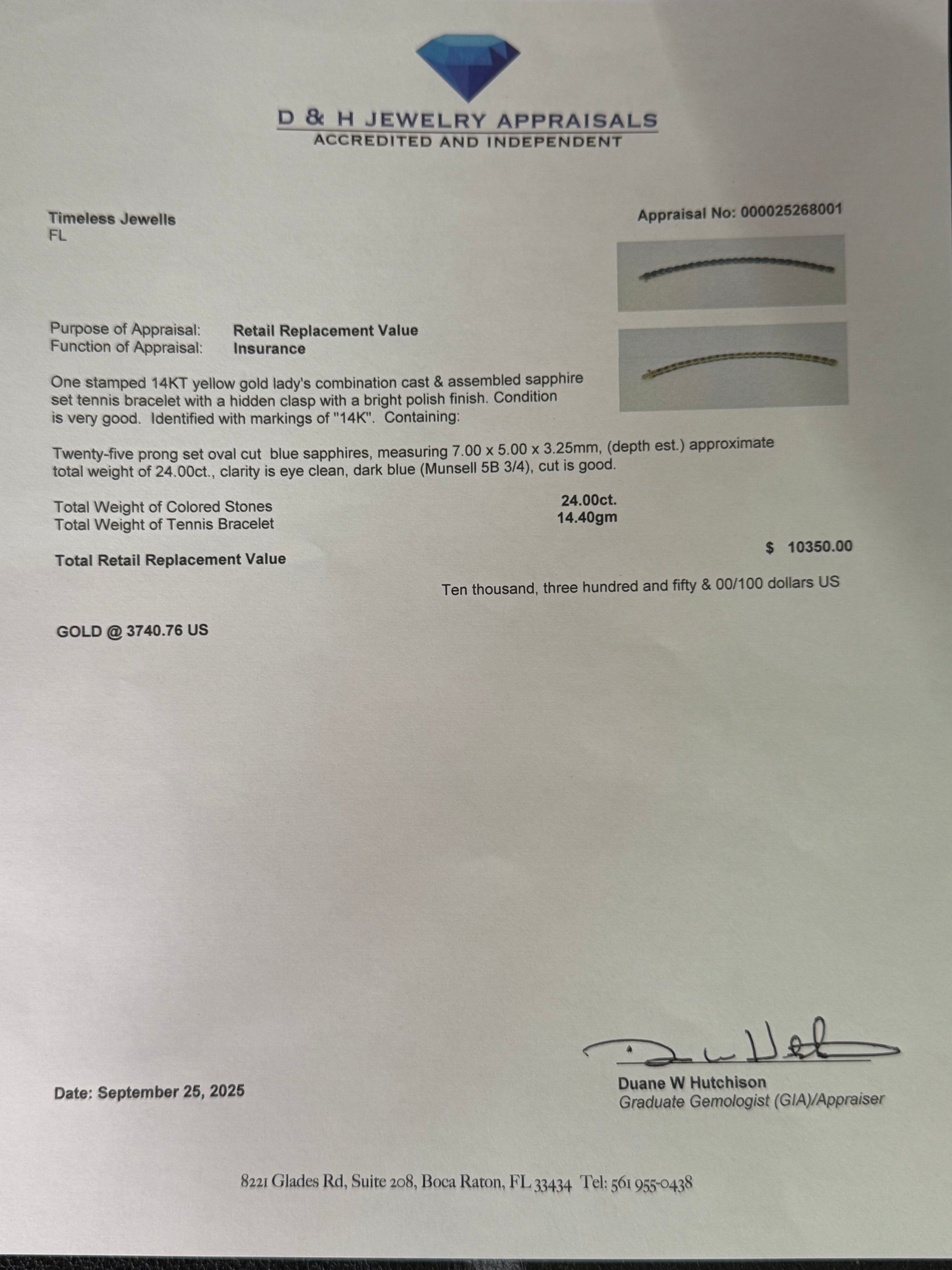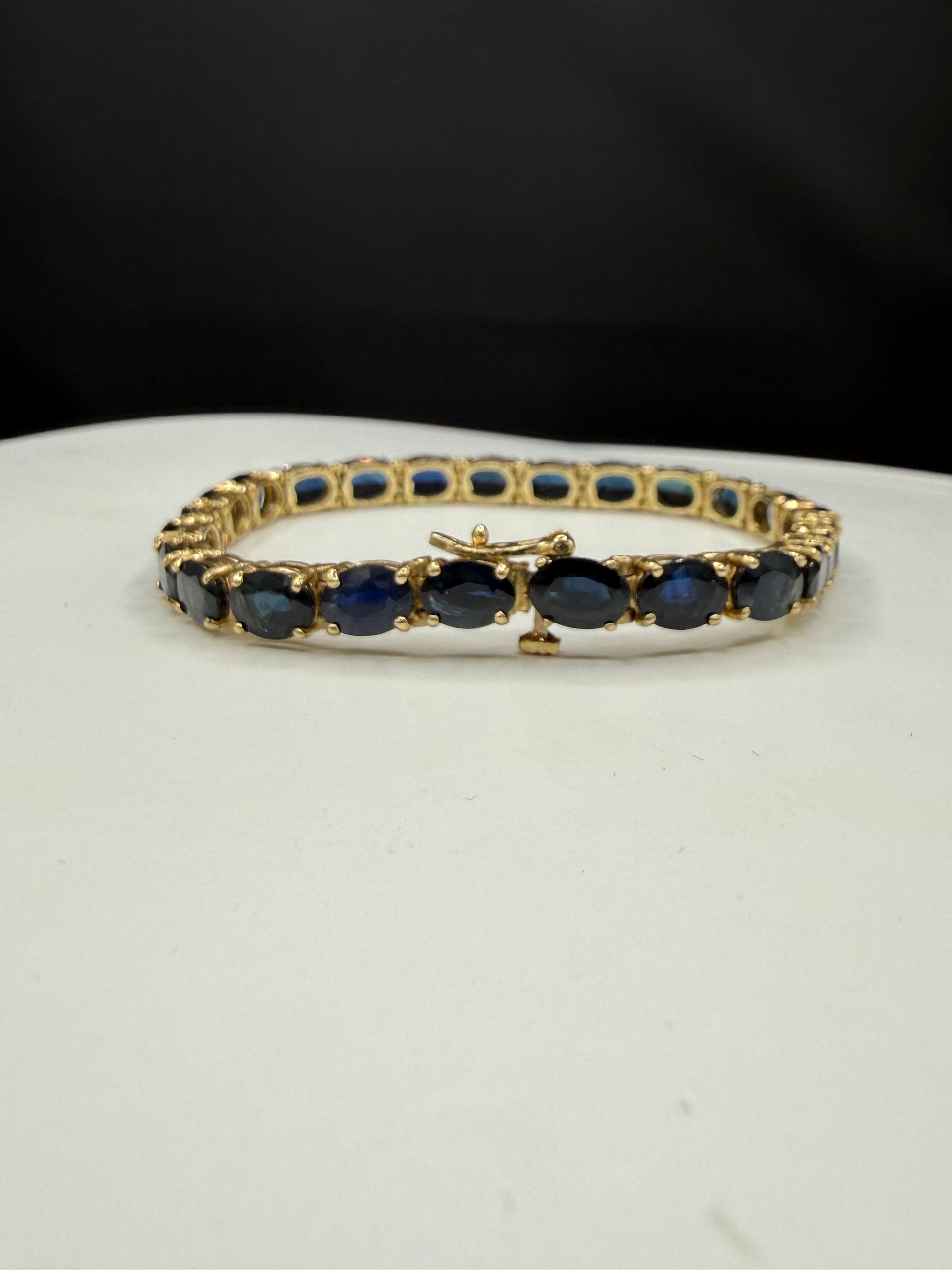 This stunning 14K yellow gold tennis bracelet is adorned with a breathtaking line of natural unheated oval-cut blue sapphires, totaling an extraordinary 24.00 carats. Each sapphire measures approximately 7.0 x 5.0 mm, showcasing a rich, dark blue hue that radiates elegance and depth. The gems are carefully prong set, allowing light to reflect and enhance their brilliance.