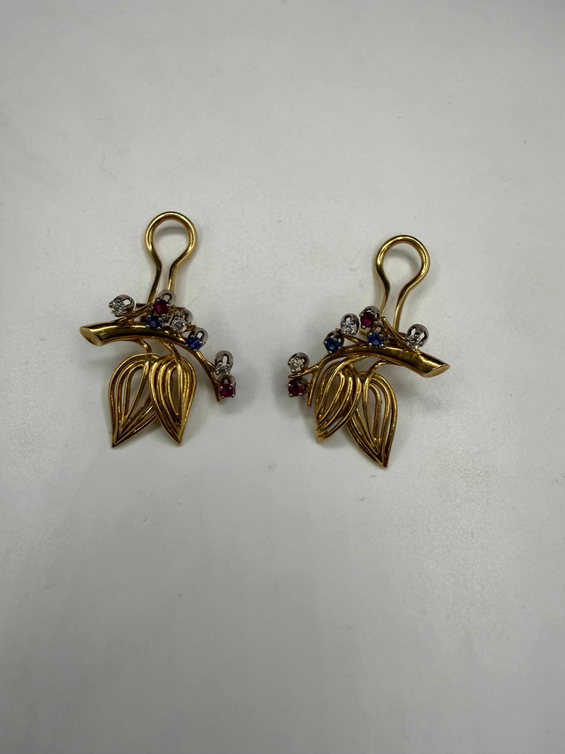 Vintage 18K Gold Diamond, Ruby & Sapphire Clip-On Earrings