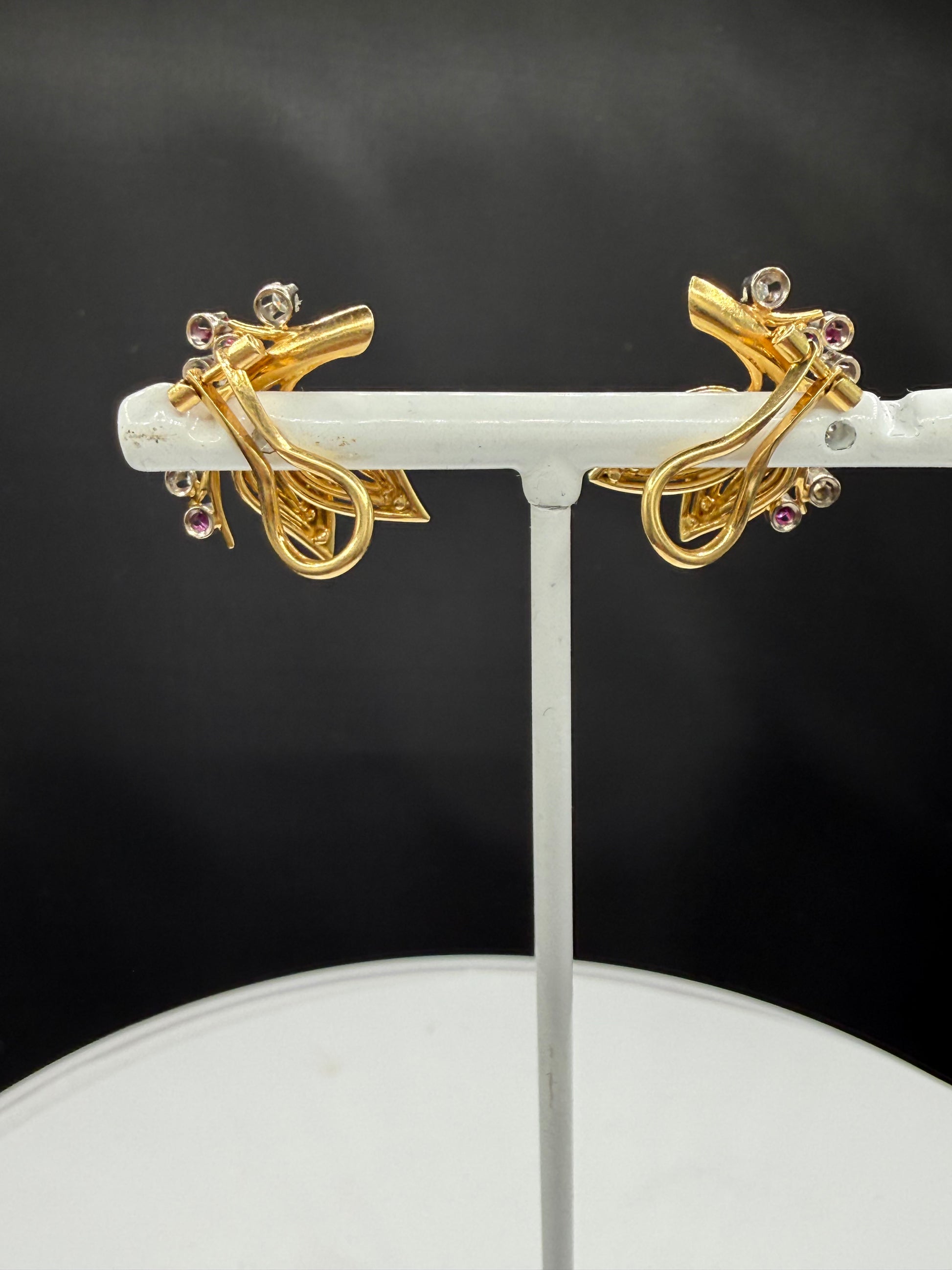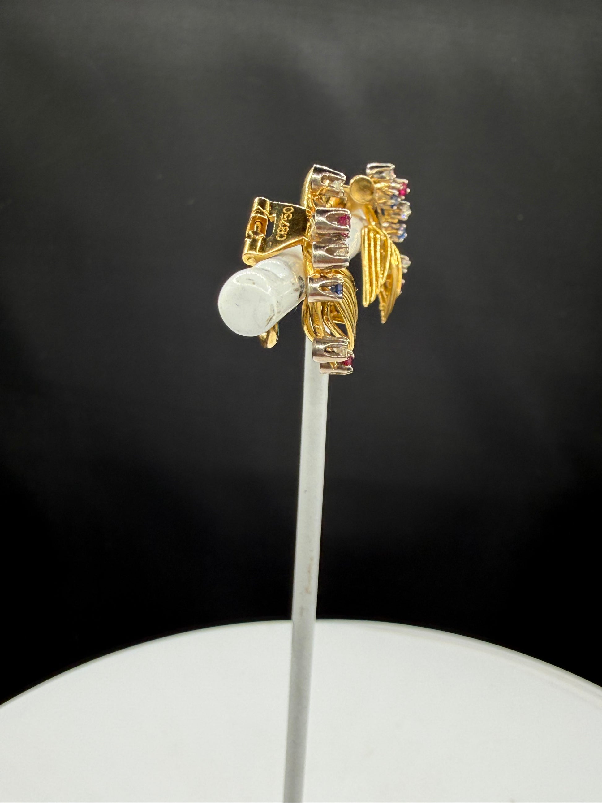 These vintage 18K yellow gold clip-on earrings showcase a striking retro floral design, set with natural diamonds, rubies, and sapphires that add a touch of timeless color and sparkle.