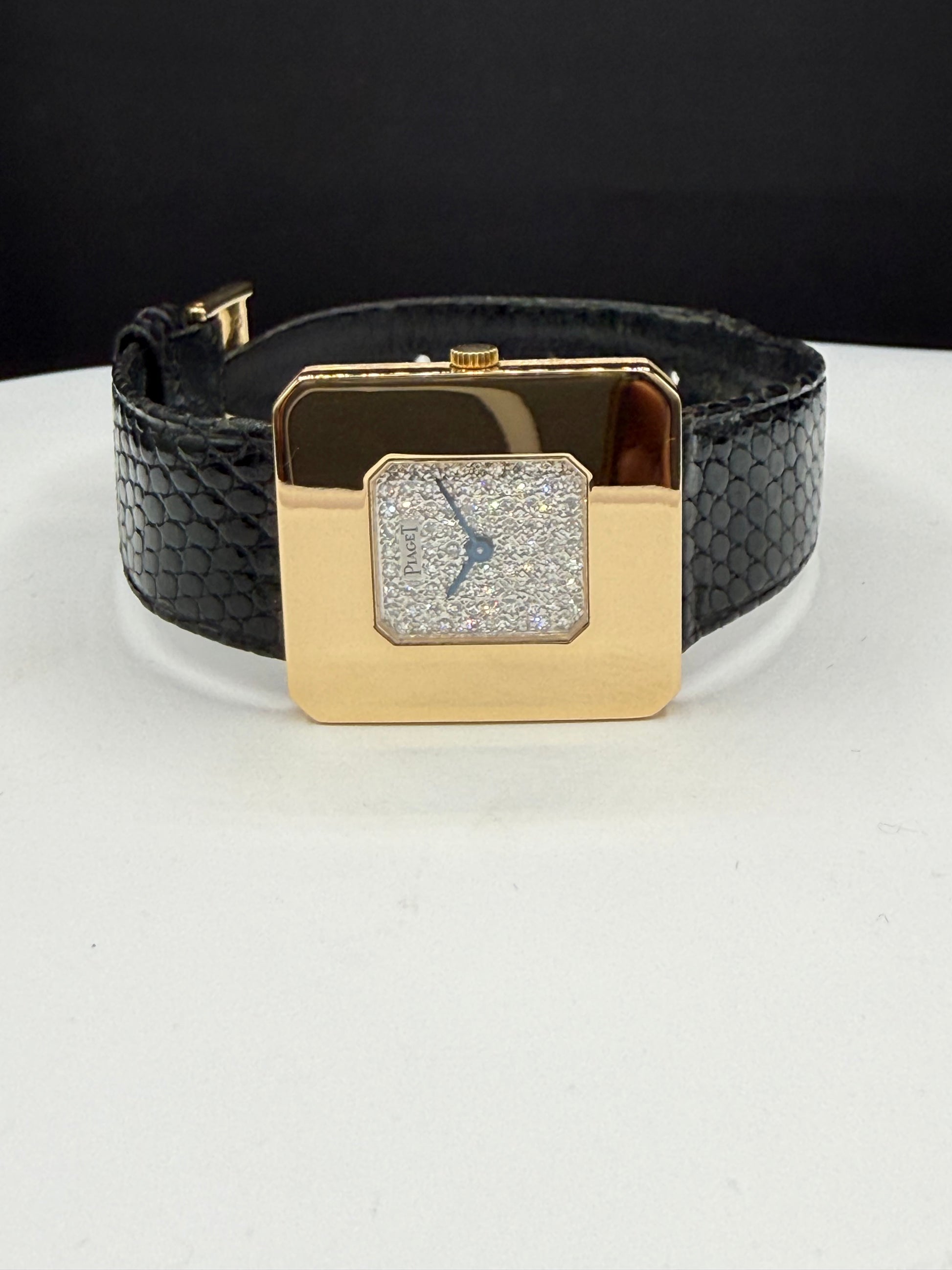 An exceptional and elegant vintage Piaget ladies wristwatch, reference 99041, dating to the 1970s. This refined timepiece showcases Piaget’s signature minimalist luxury, elevated by a factory pavé-set diamond dial that delivers timeless brilliance and unmistakable prestige.